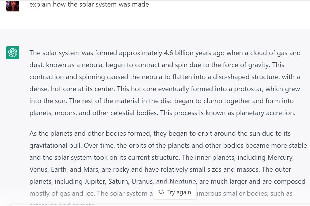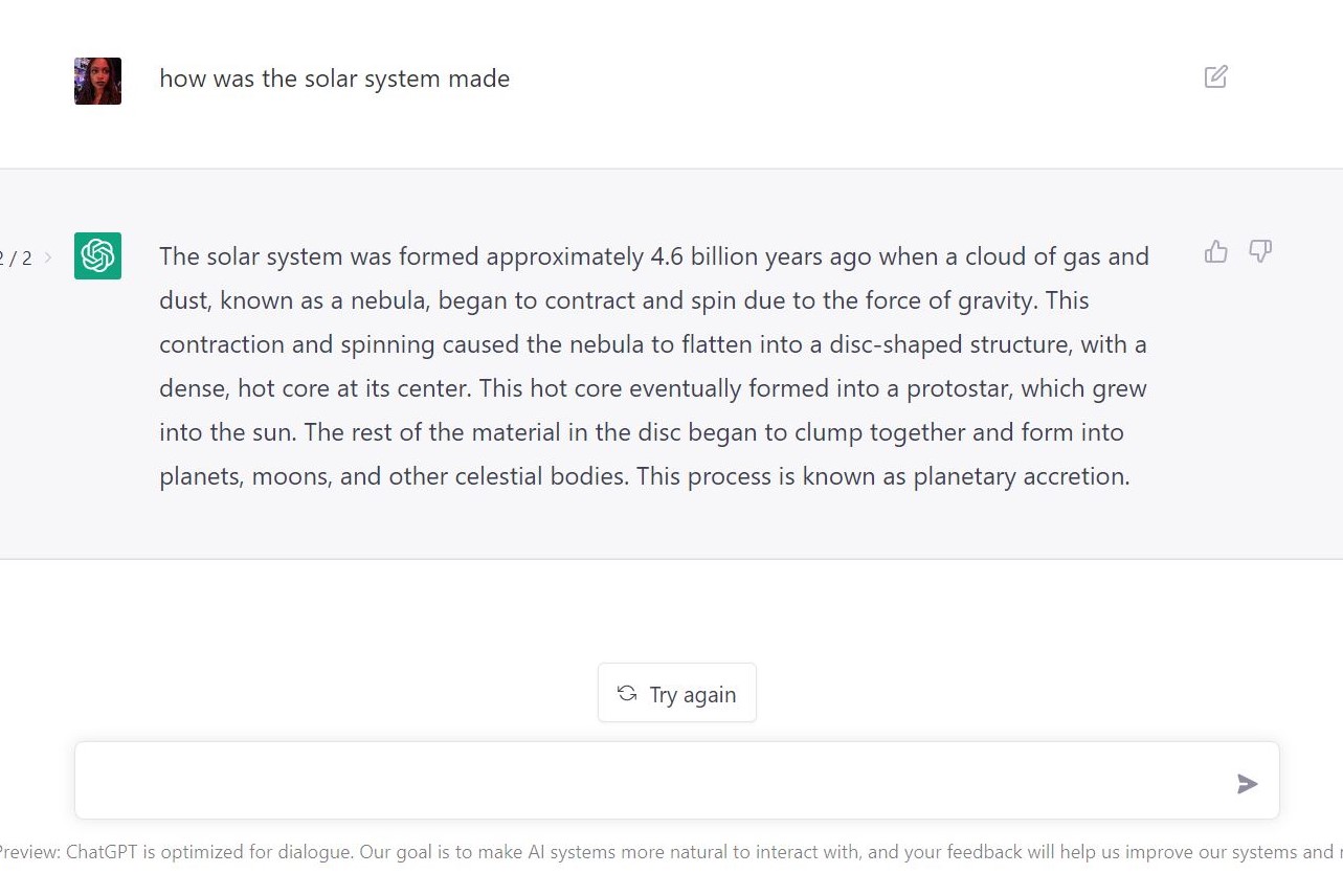 For example, starting with “Explain how the solar system was made” will give a more detailed result with more paragraphs than “How was the solar system made,” even though both inquiries will give fairly detailed results. Take it a step further by giving ChatGPT more guidance about style or tone, saying “Explain how the solar system was made as a middle school teacher.”